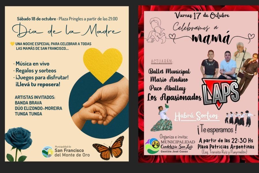 La madres del departamento Ayacucho serán protagonistas este fin de semana de los festejos que realizarán en Candelaria, San Francisco del Monte de Oro, Luján y Quines con motivo del Día de la Madre. Todos los eventos contarán con entrada libre y gratuita.