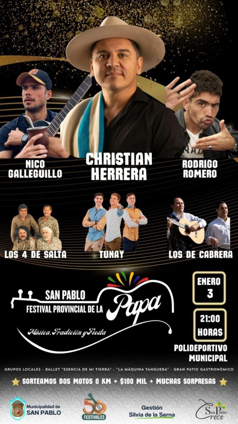 San Pablo, la localidad próxima a Tilisarao y Renca, vivirá la 13° edición de su festival, el sábado 3. El encuentro se realizará en el Polideportivo Municipal ‘Gabriel Ferrari’, a partir de las 20:00. Las entradas anticipadas tienen un costo de $10.000 y en boletería, $15.000.