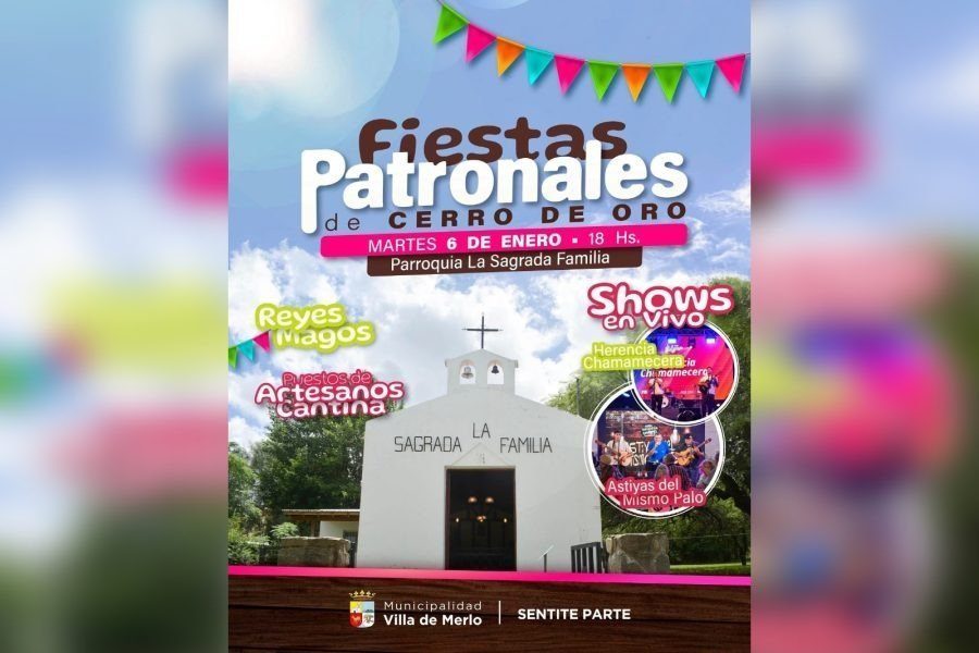 La comunidad merlina y de la región se preparan para celebrar a lo grande las Fiestas Patronales de Cerro de Oro. La tradicional celebración promete un encuentro lleno de fe, cultura, raíces locales y fraternidad social. La actividad se desarrollará este martes 6, desde las 18:00, en la parroquia La Sagrada Familia, con entrada libre y gratuita.